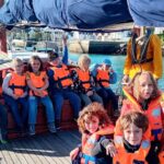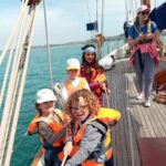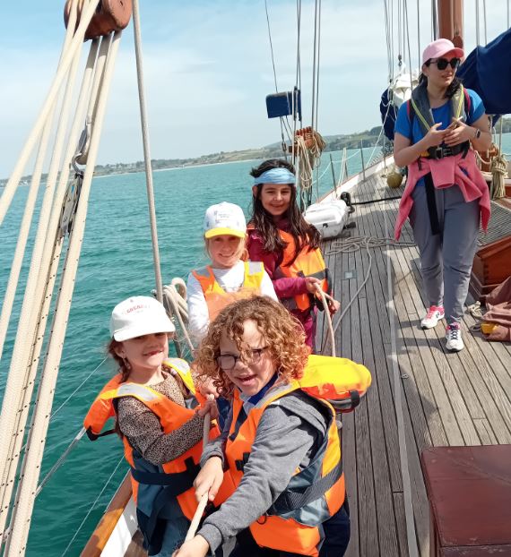 Les CP CE1 de Madeline Willemse se sont rendus par demi-classe sur le Skeaf, au port de Tréboul, pour une promenade dans la baie de Douarnenez. A défaut de car, ils ont été acheminés jusqu’au voilier… en bateau ! Les petits mousses ont hissé la trinquette et l’artimon, observé les animaux marins à la jumelle, visité la cabine et découvert la timonerie avec tous ses appareils… Cerise sur le gâteau: chacun a pu tenir la barre de ce bateau centenaire!